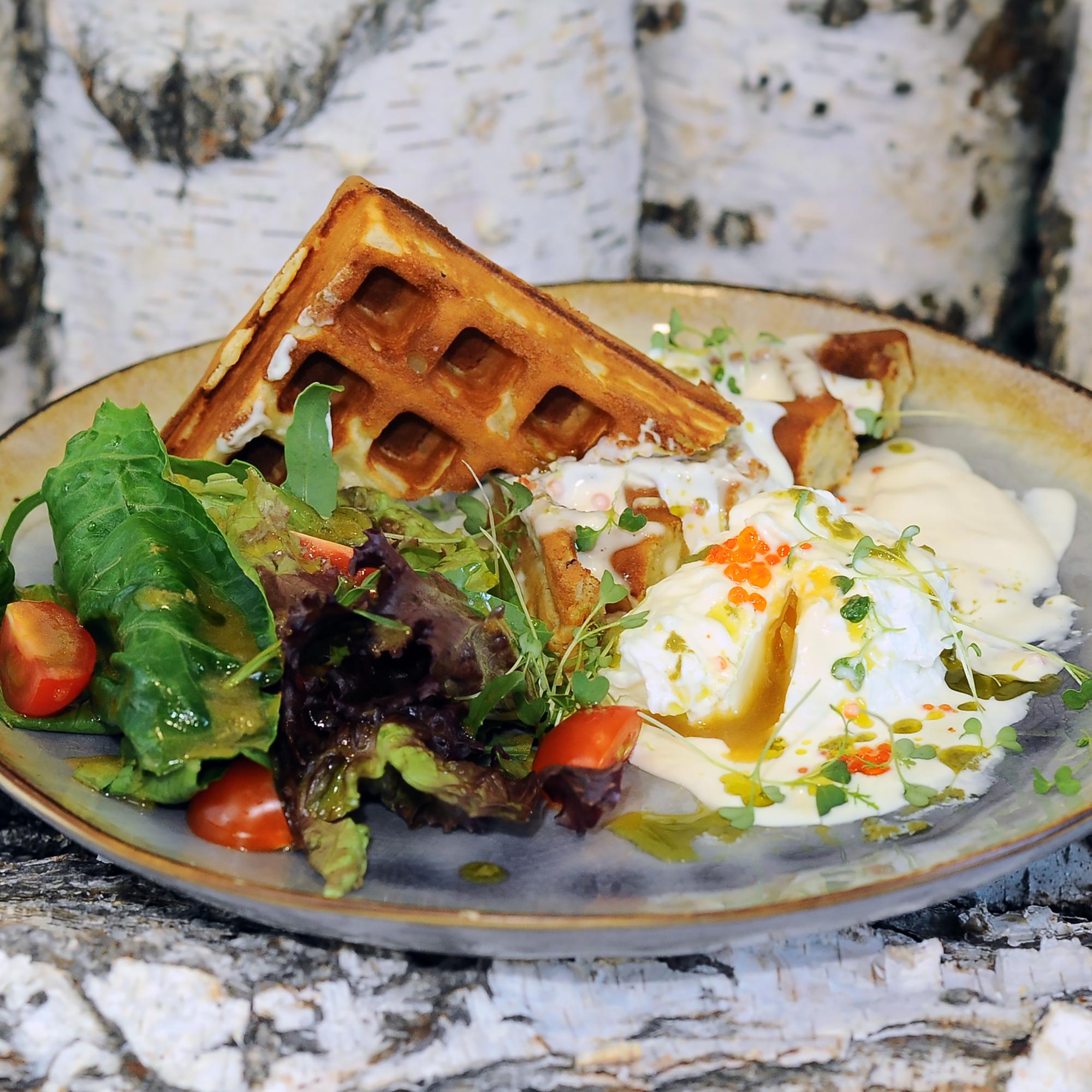 Вафля из пшеничной муки, сливки, икра кеты, яйцо куриное, микс салата, томаты черри, микрозелень, масло зеленое |