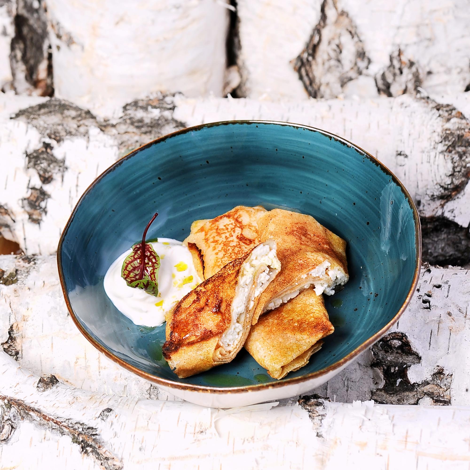 блины с творогом, сметана, сливочное масло, масло зеленое, микрозелень |