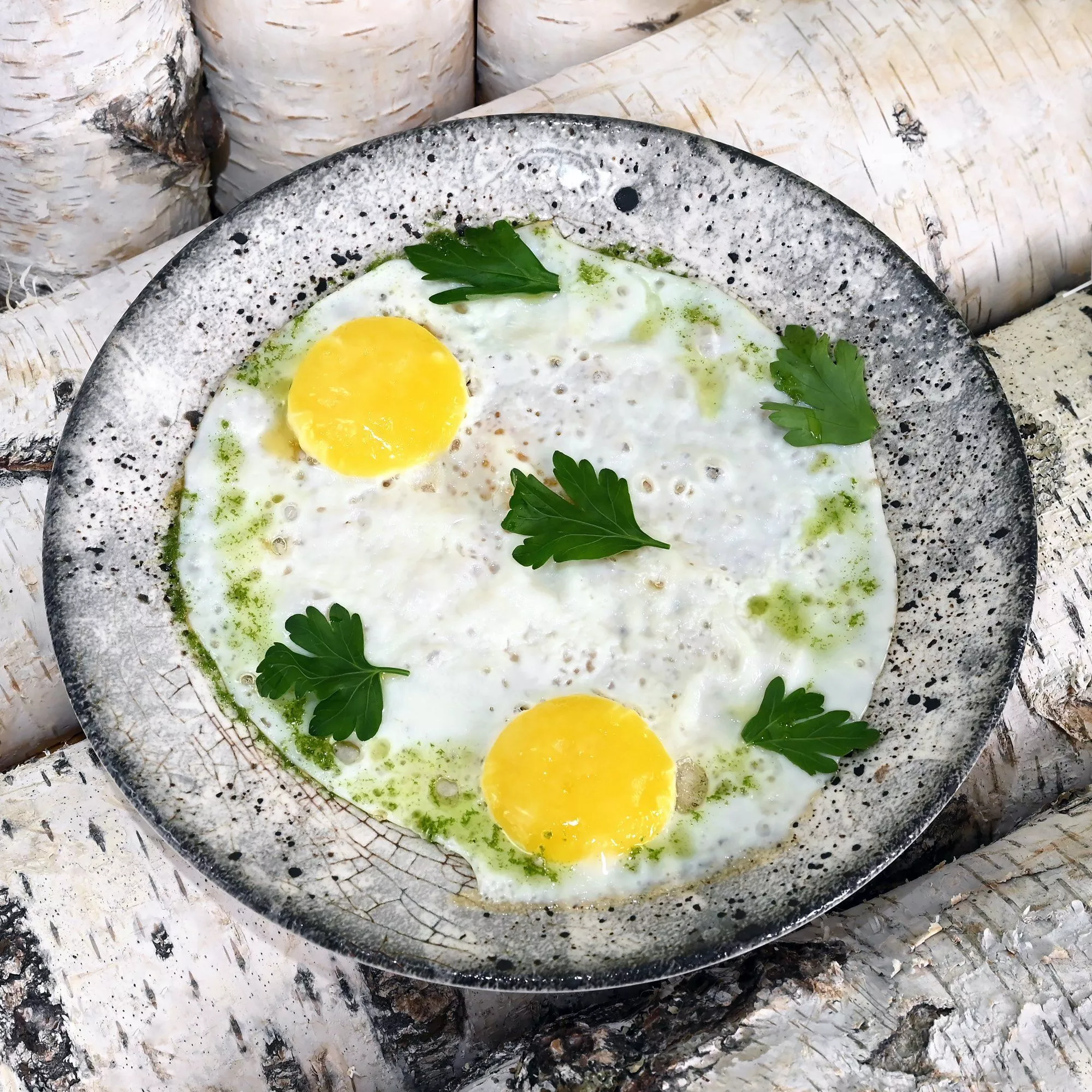 Яйцо куриное, оливковое масло, специи, микрозелень. |
