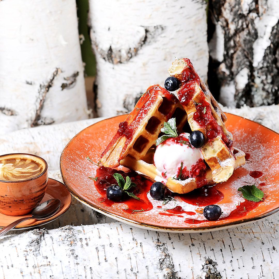 Вафля из пшеничной муки, голубика, ванильное мороженое, брусничный соус. |