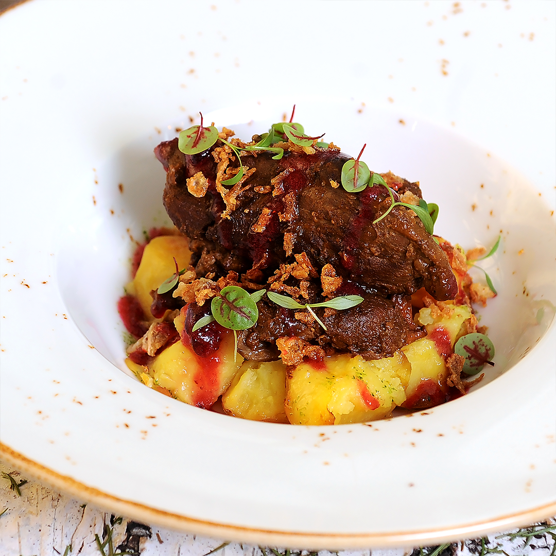 —Оленина томлёная в пиве с печёным картофелем и луковым кранчем