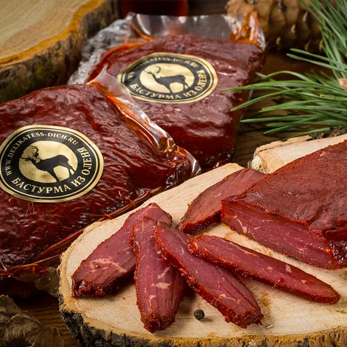 Оленина, говядина, телятина, специи, фиксатор окраски: нитрит натрия, соль.