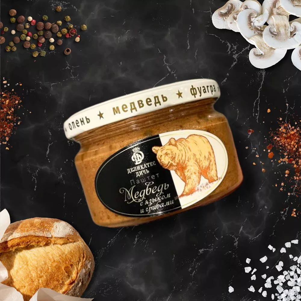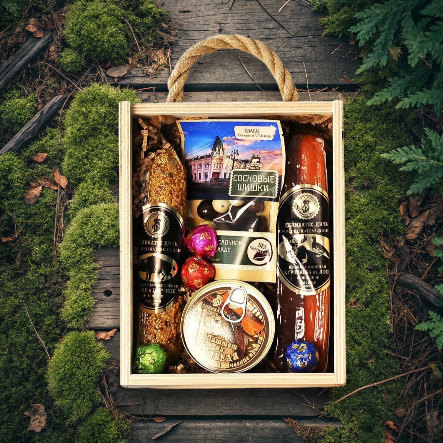 Колбаса «Кабан» с горчицей, Колбаса вяленая из мяса куропатки и лося, Паштет из мяса медведя, Сосновые шишки в тёмном, молочном, белом шоколаде, Шоколадные конфеты «Ассорти».