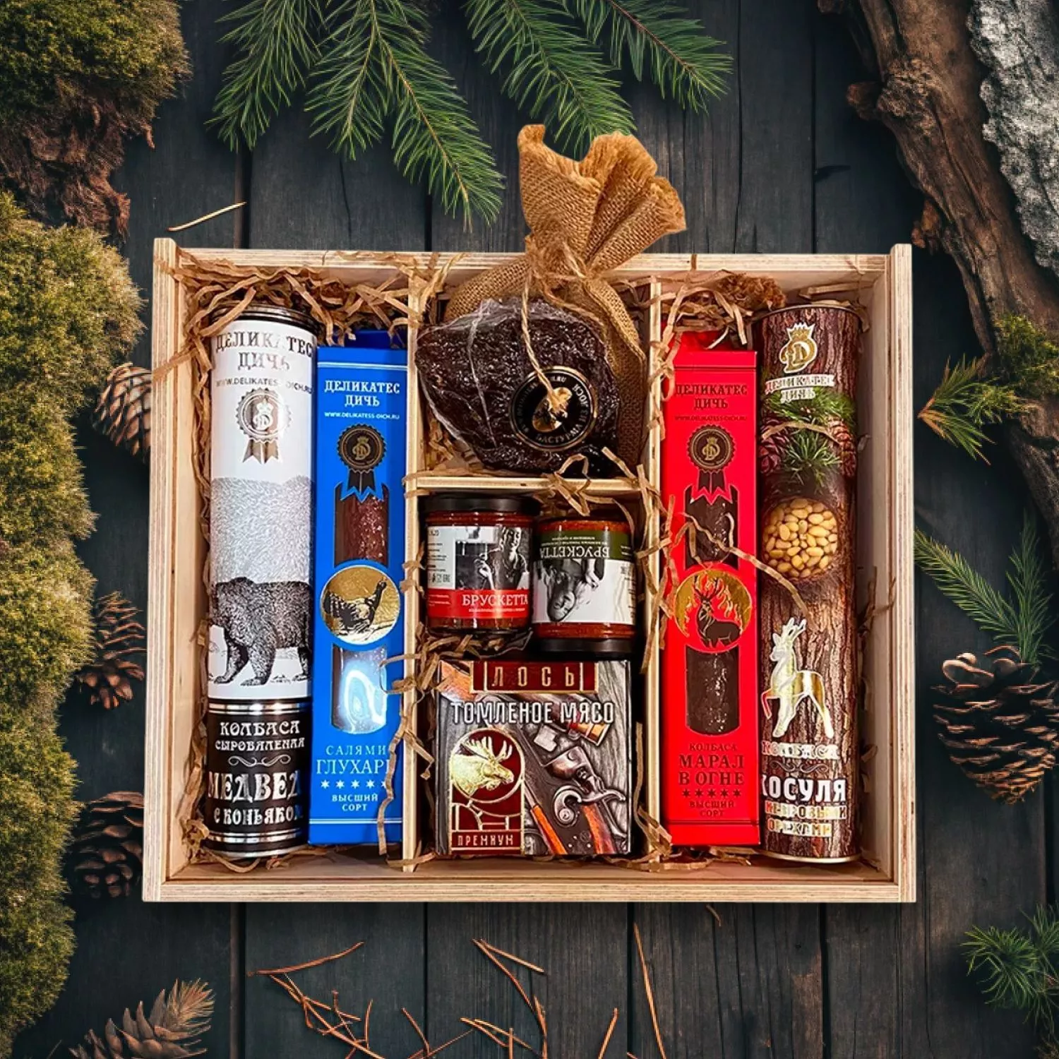 Колбаса салями из мяса Глухаря в подарочной упаковке «Деликатес Дичь».Колбаса из мяса Марала в подарочной упаковке «Деликатес Дичь»;