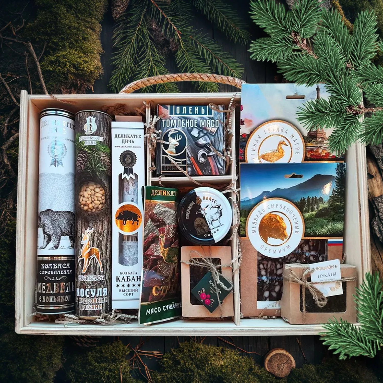 В стоимость набора входит деревянный бокс с крышкой #ФедяДичь. При желании можно дополнительно подобрать новогоднюю крышку либо крышку-картину омского художника Сергея Демиденко с пейзажами зимнего г.Омска (наличие и ассортимент уточняйте у менеджера при оформлении заказа)