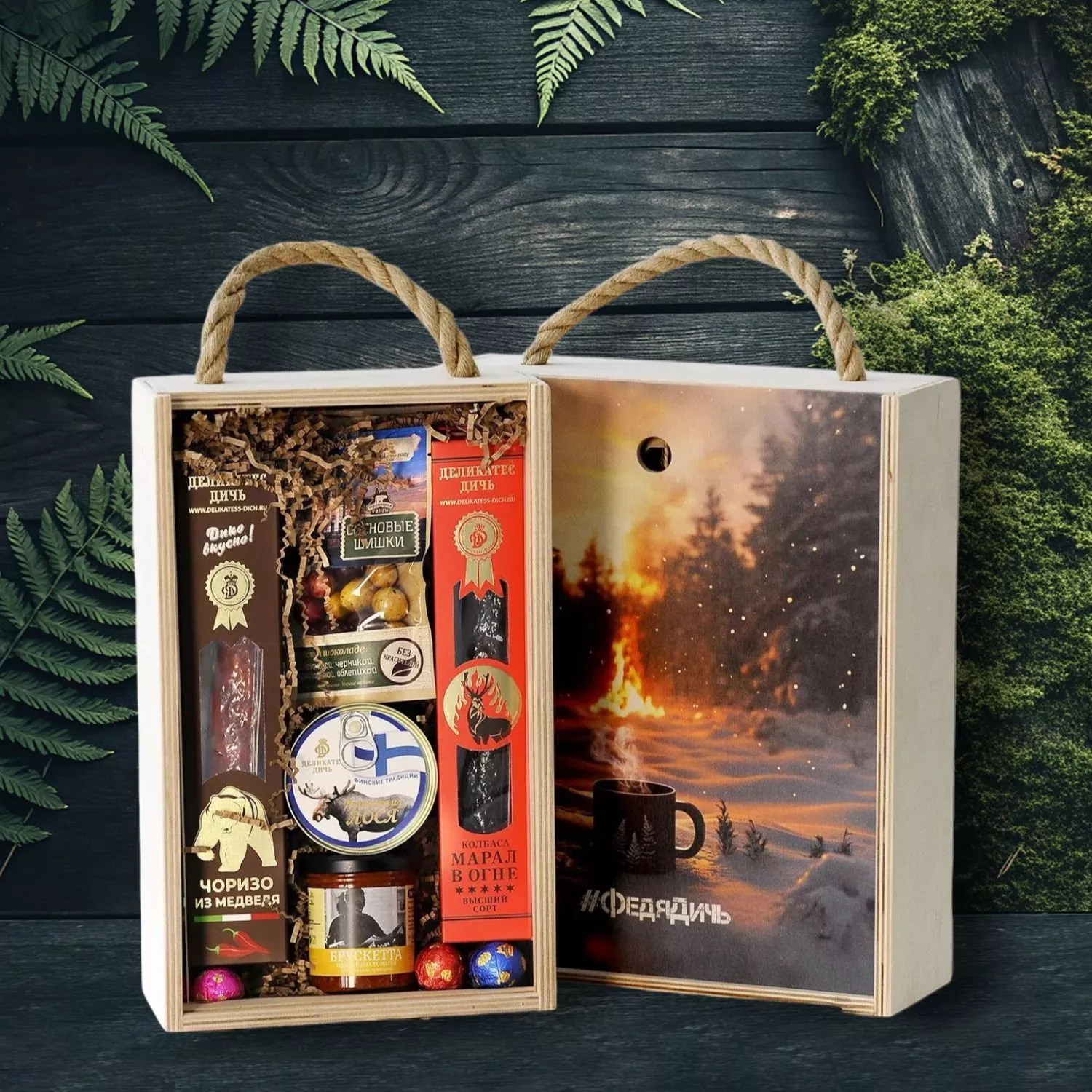 В стоимость набора входит деревянный бокс с крышкой #ФедяДичь. При желании можно дополнительно подобрать новогоднюю крышку либо крышку-картину омского художника Сергея Демиденко с пейзажами зимнего г.Омска (наличие и ассортимент уточняйте у менеджера при оформлении заказа)