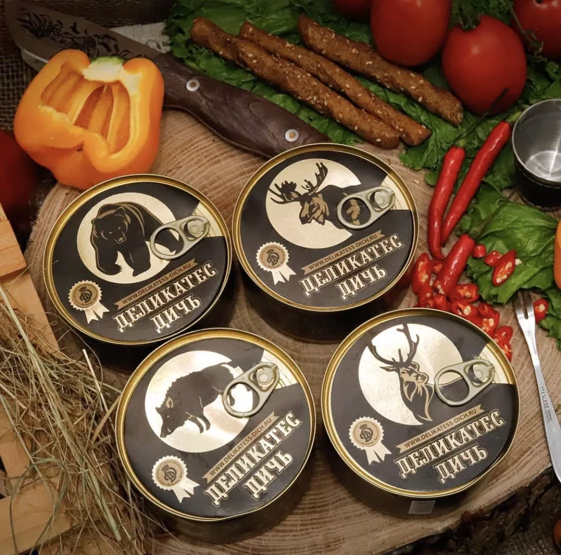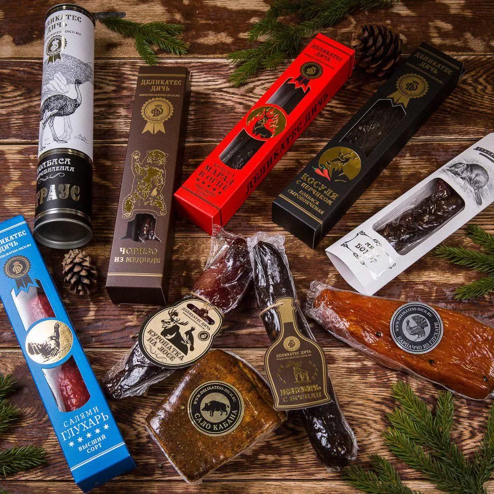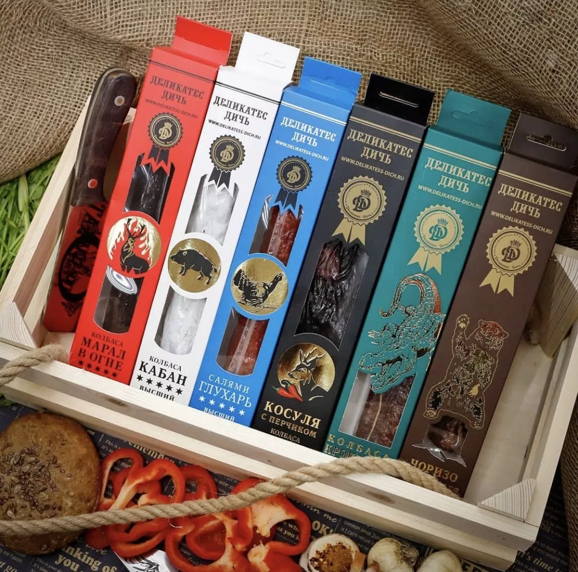 Уникальная на российском рынке торговая марка «ДЕЛИКАТЕС-ДИЧЬ» В ассортименте представлены не просто мясные изделия высшего качества, а настоящие экологически чистые деликатесы из конины, баранины, лося, оленины, бобра, кабана, медведя, глухаря, дикого гуся и утки, куропатки, косули, марала, перепелки, рябчика, фазана, кролика, зайца и страуса. Эти деликатесы украсят ваш стол на любое событие, станут изысканным подарком или сувениром из России, приятно удивят истинных охотников и настоящих ценителей мясных продуктов.